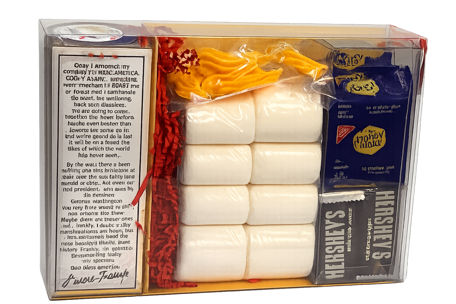 We handmake every part of this product. Marshmallow and candy hair are wrapped for freshness, and packaged graham crackers and chocolate are included. Since our s'mores are individually handcrafted, minor visual variations in marshmallow or candy hair are to be expected. However, if you are not satisfied with your S'more Trump for any reason, please contact us directly so we can earn your 100% satisfaction. S'more Trumps are best when eaten within 2-3 months of purchase.